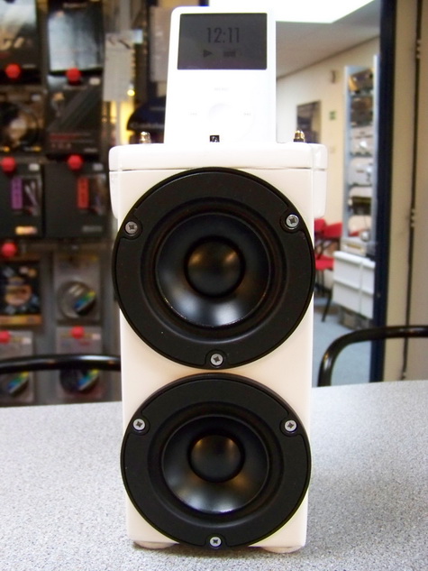 Deze klant heeft heeft uit een bestaand apparaat van Pioneer de ipod dock gehaald en daar zelf een kastje met een versterker een een accu-tje omheen gebouwd.